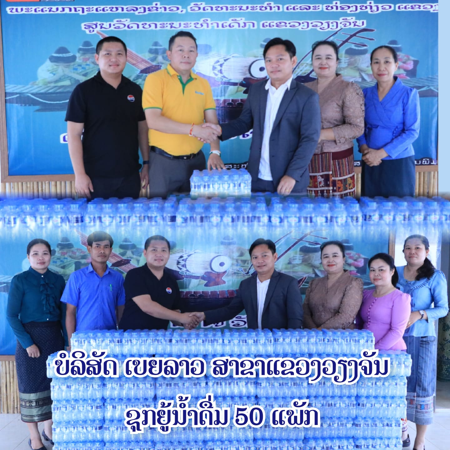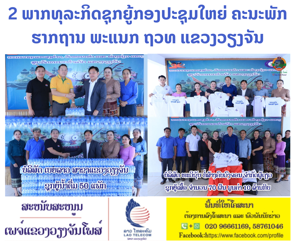 2 ພາກສ່ວນທຸລະກິດ ປະກອບສ່ວນຊຸກຍູ້ ນ້ຳດື່ມ ແລະ ເສື້ອ ກອງປະຊຸມໃຫຍ່ຄະນະພັກຮາກຖານພະແນກ ຖວທ ແຂວງວຽງຈັນ ຄື: ຕົວແທນບໍລິສັດເບຍລາວສາຂາແຂວງວຽງຈັນ ນຳໂດຍທ່ານ ຜາສຸກ ສີວິໄລ ຜູ້ຈັດການເຂດ ແຂວງວຽງຈັນຕອນລຸ່ມ ໄດ້ອຸປະຖຳ ນ້ຳຕຸກນ້ອຍ ຈຳນວນ 50 ແພັກ.