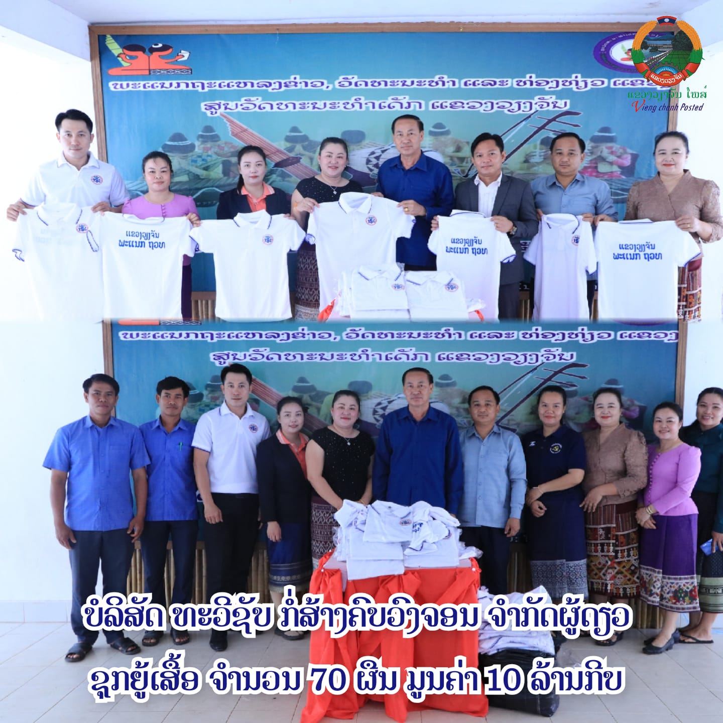 ແລະ ທ່ານນາງ ບຸນທະວີ ແສງພະຈັນ ປະທານ ບໍລິສັດ ທະວີຊັບ ກໍ່ສ້າງຂົວທາງຈຳກັດ ໄດ້ອຸປະຖຳເສື້ອໂປໂລ ຈຳນວນ 70 ຜືນ ມູນຄ່າ 10 ລ້ານກີບ, ຕາງໜ້າຮັບໂດຍ ຄະນະພະແນກ ຖວທ ແຂວງວຽງຈັນ .